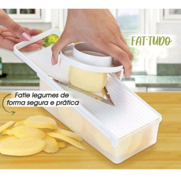 Fatiador manual de legumes, frutas e queijos com recipiente